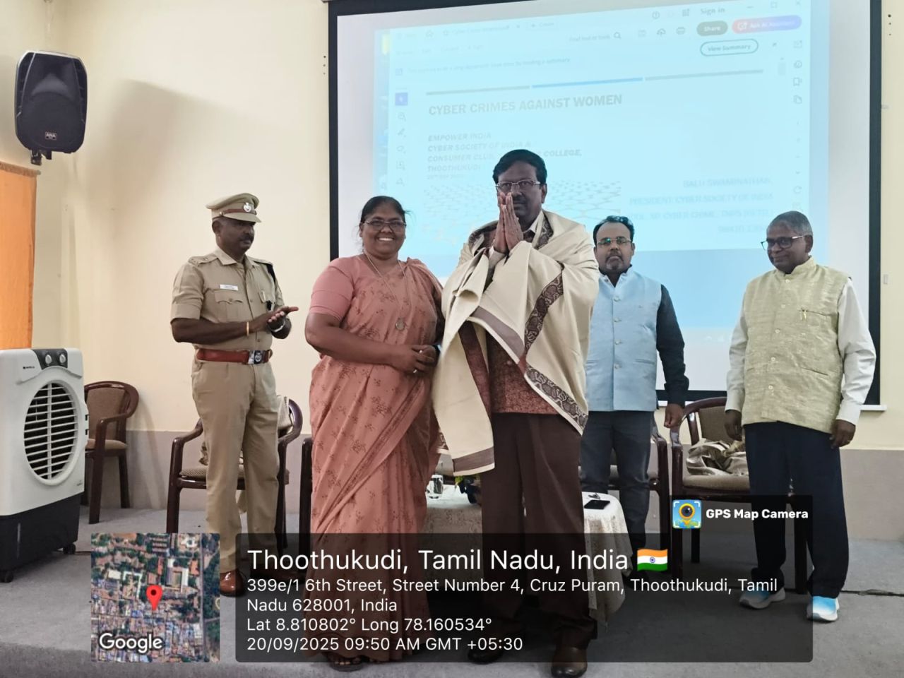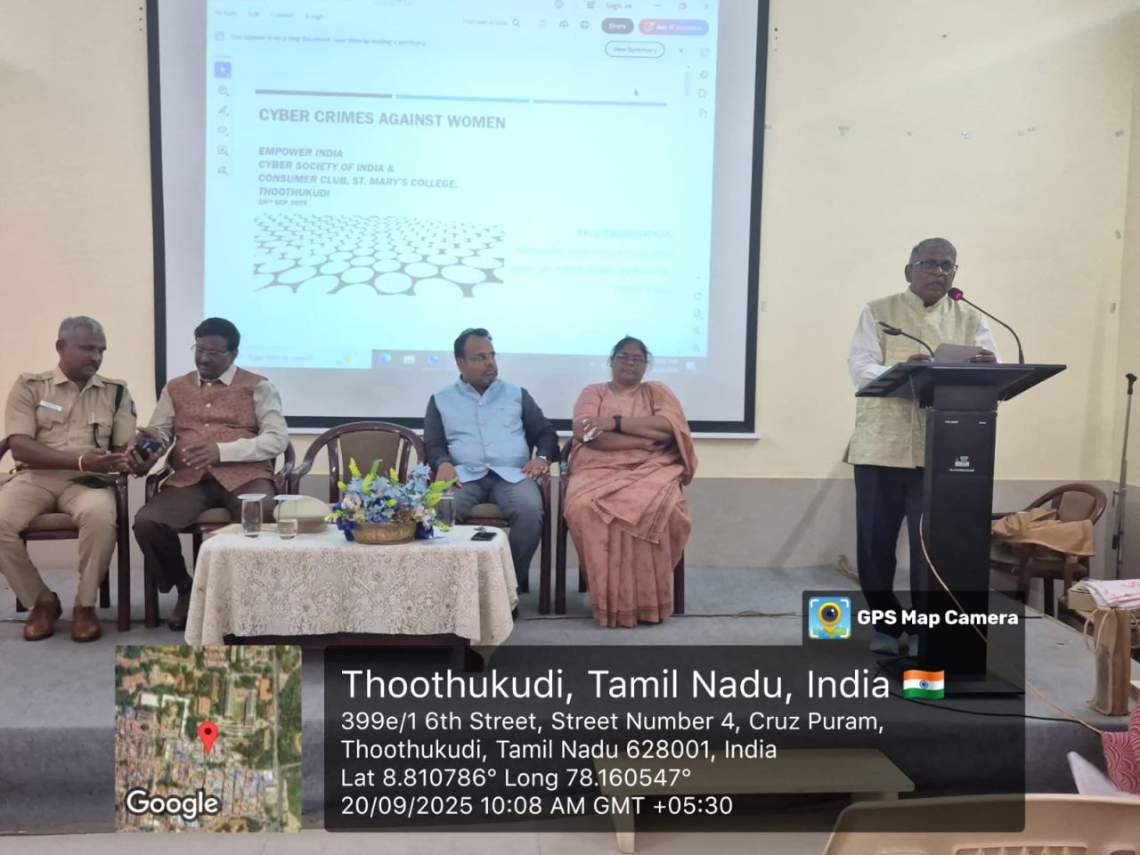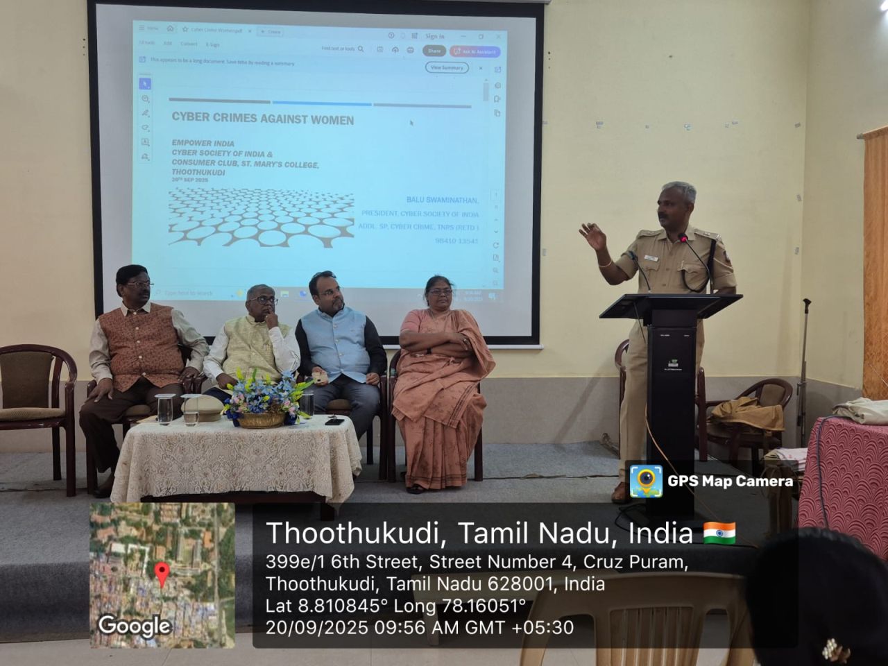 Empower India, Cyber Society of India, and Consumer Club, St. Mary’s College (Autonomous), Thoothukudi, successfully organized a Special Awareness Program on “Cyber Crimes Against Women” on 20th September 2025 at Star Hall, St. Mary’s College.